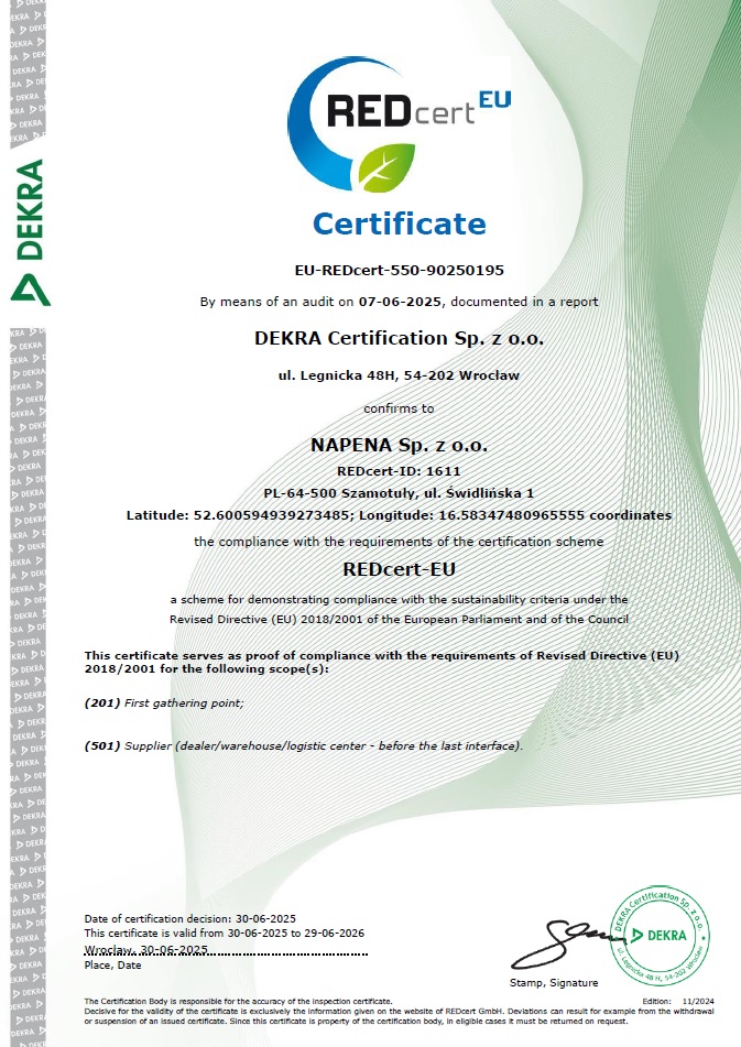 Dnia 07 czerwca 2025 roku odnowiliśmy oficjalny certyfikat podmiotu skupowego według kryteriów zrównoważonego rozwoju, wydany przez DEKRA Certification GmbH. System REDcert to system certyfikacji biomasy, który od 5 grudnia 2010 roku obowiązuje na terenie Unii Europejskiej.